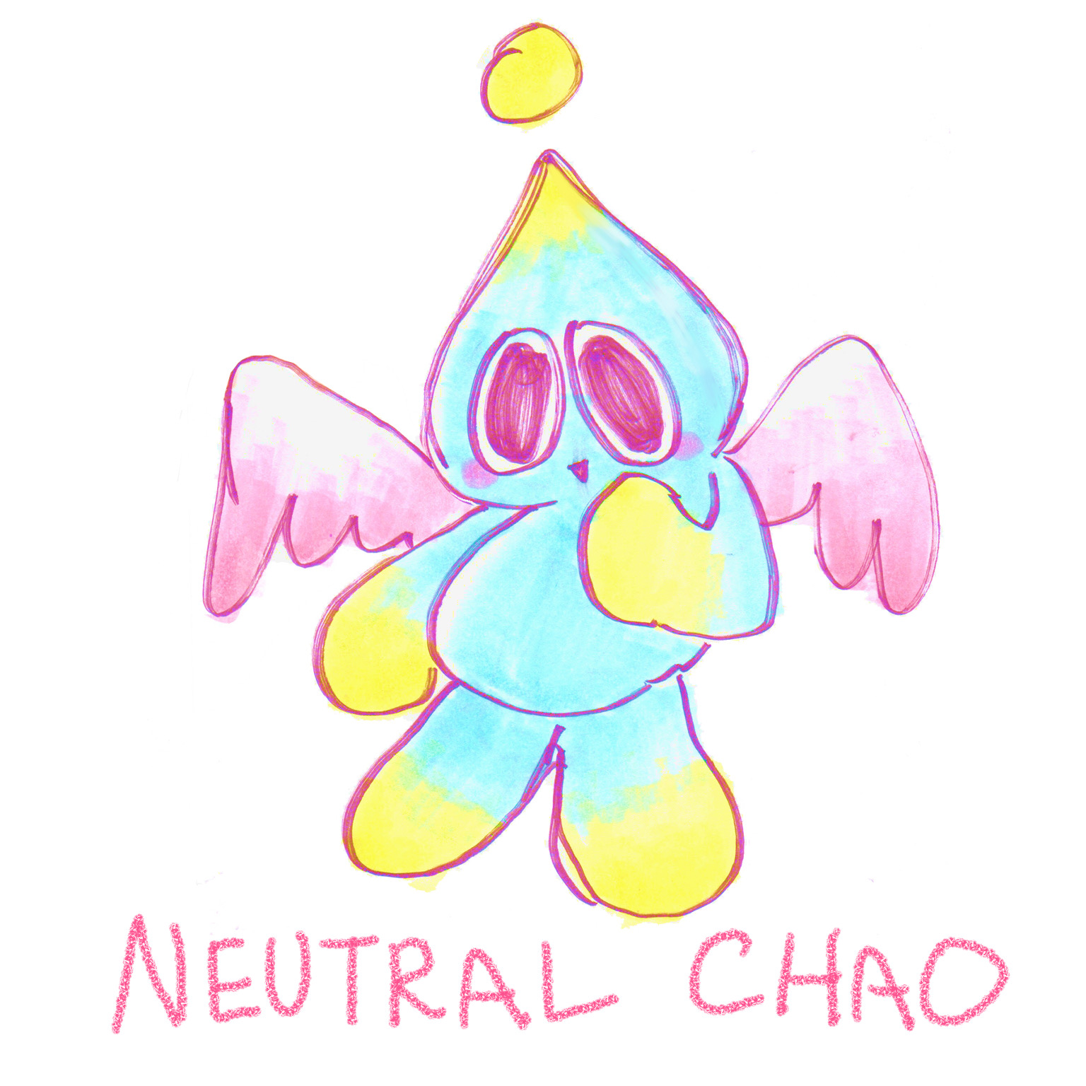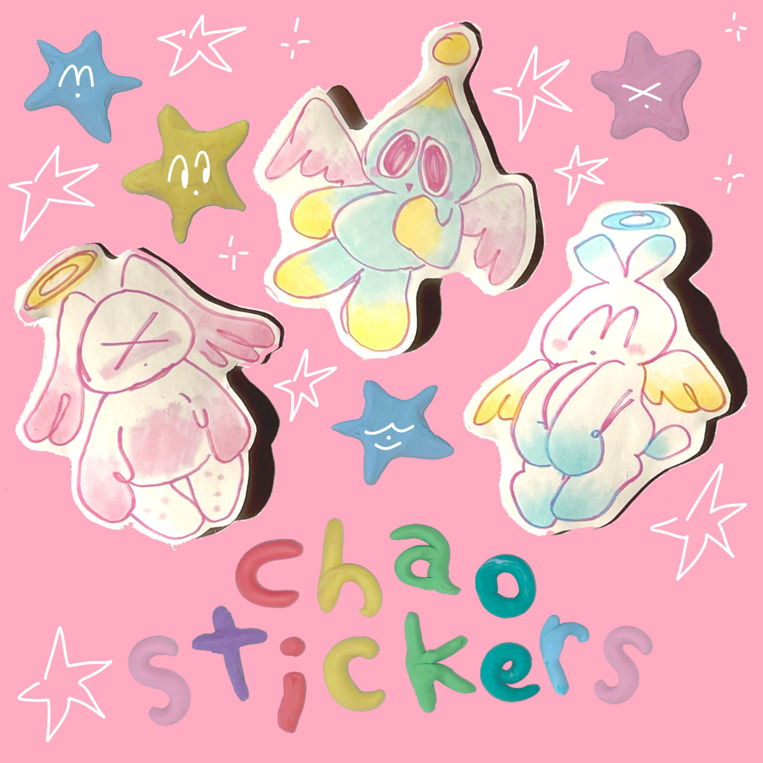 3 inch stickers of an angel chao, hero chao, and neutral chao from sonic adventure 2!