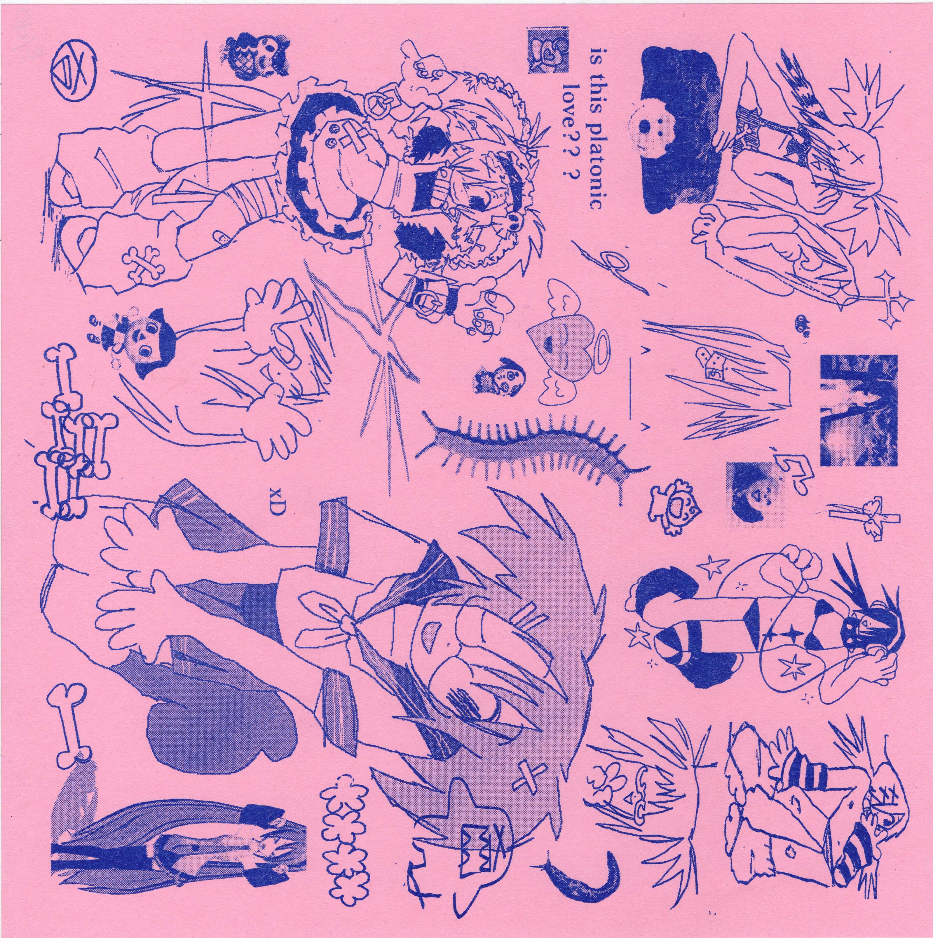 self printed using risograph. medium blue ink on a pastel pink paper.
