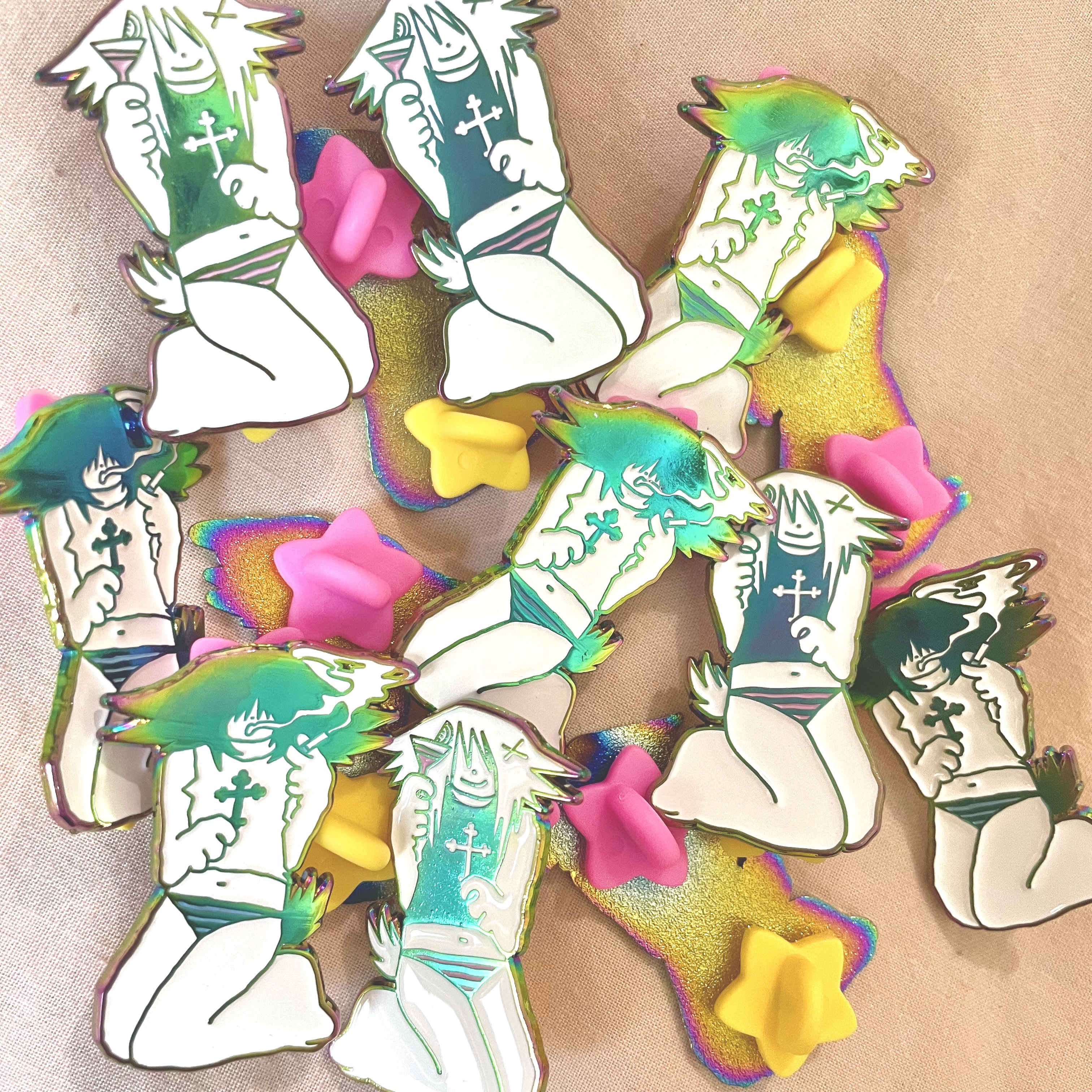 each pin is unique! pins will vary in colour & “rainbow effect” due to the anodizing process, making it even more special and one of a kind ^^