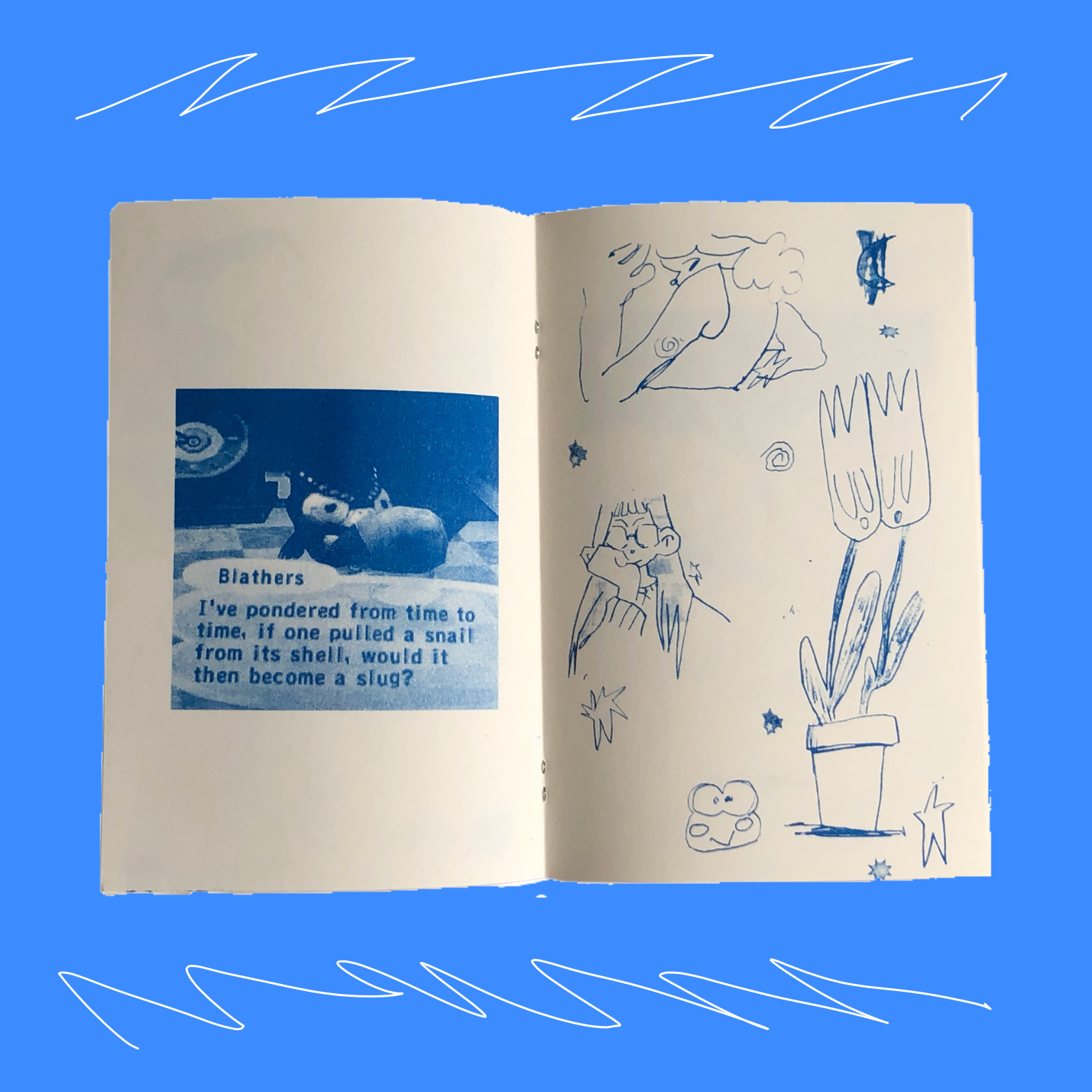 self printed using risograph. printed with blue ink on warm white paper. measures 8.5 x 5.5 inches