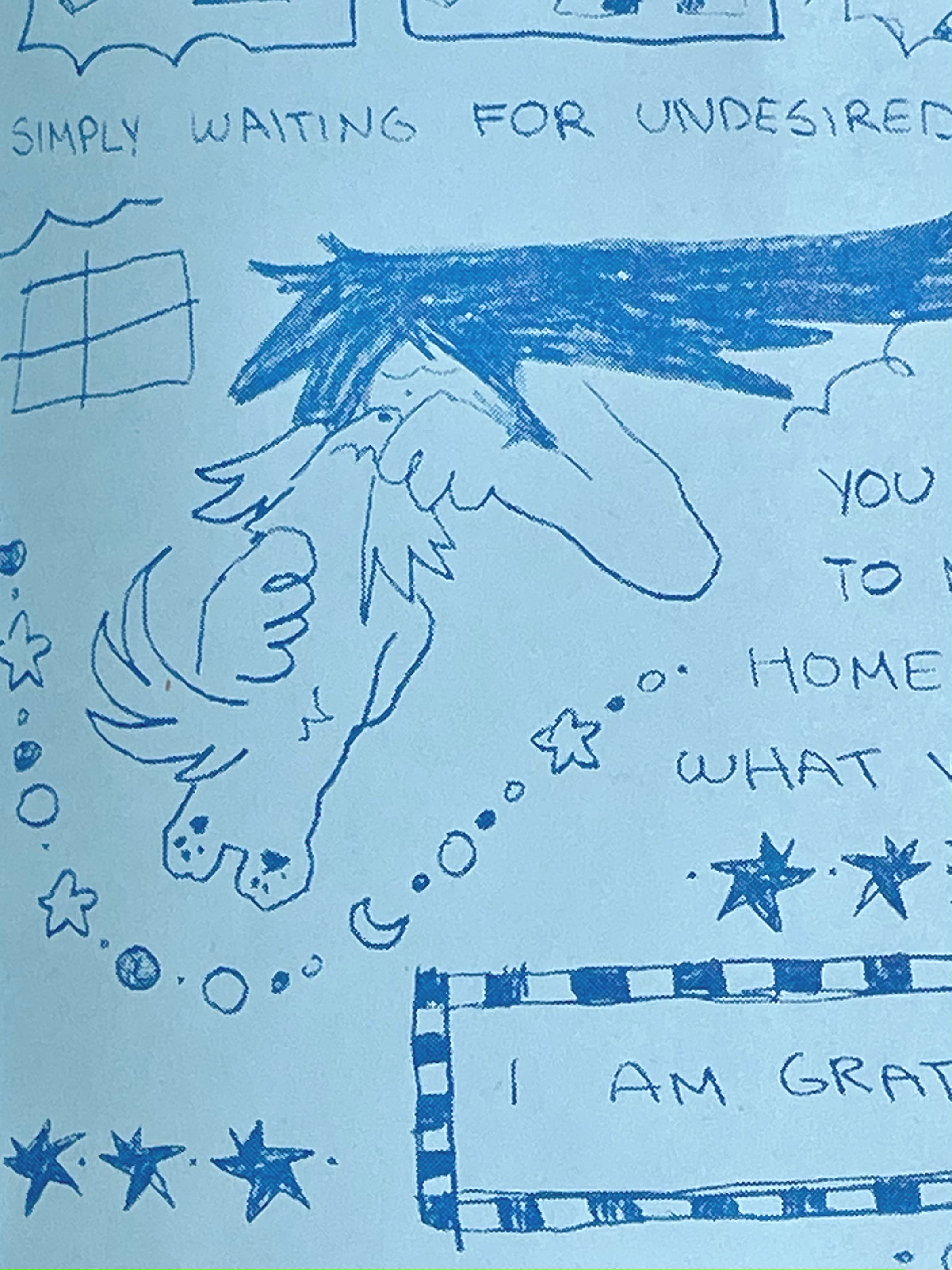 self printed two-colour risograph zine, printed with blue and yellow ink on soft blue paper. measures 8.5 x 5.5 inches
