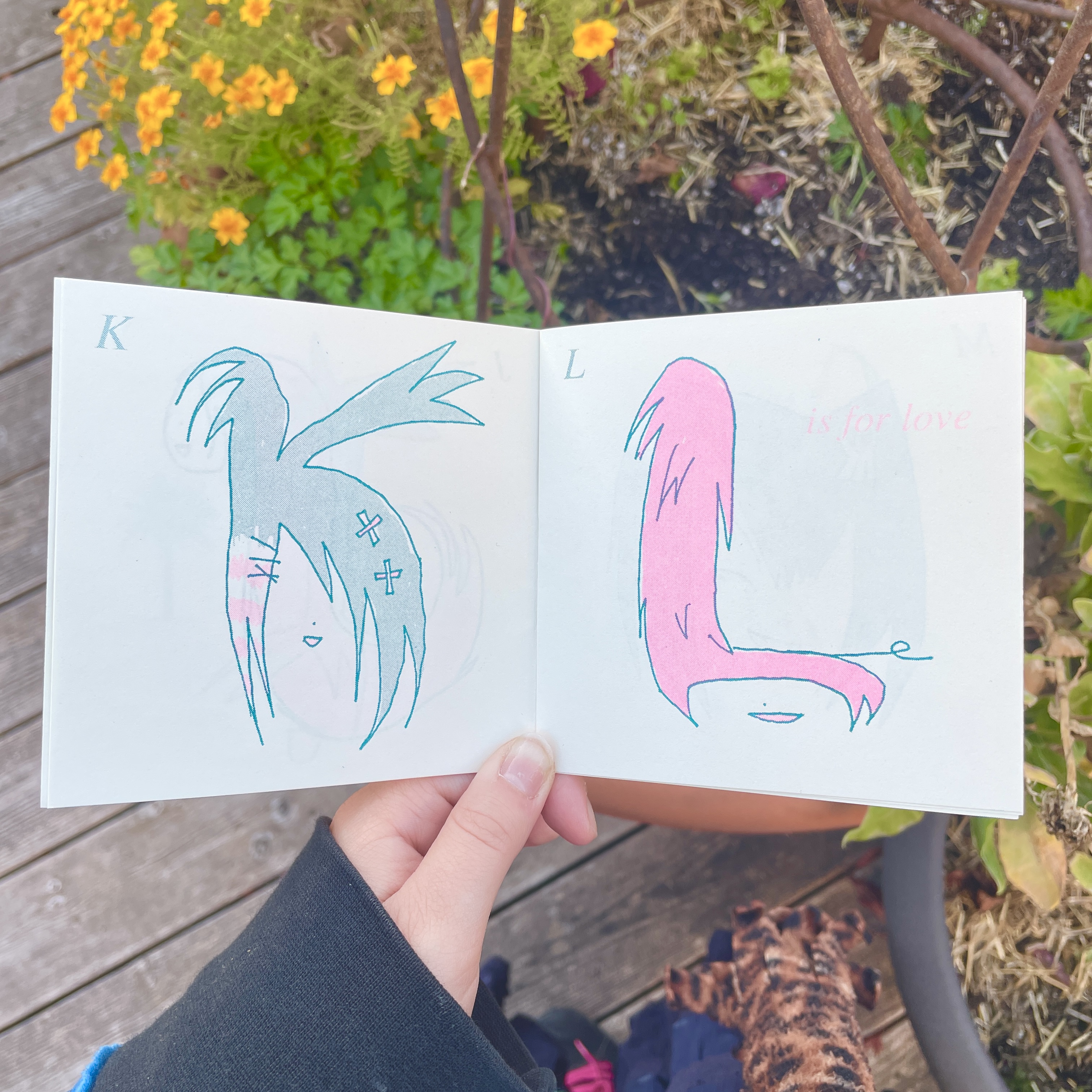 self printed two-colour risograph zine. Printed in teal and fluorescent pink ink on a pastel pink cover and soft cream inner pages. Measures approx. 4.25 x 4.25 inches