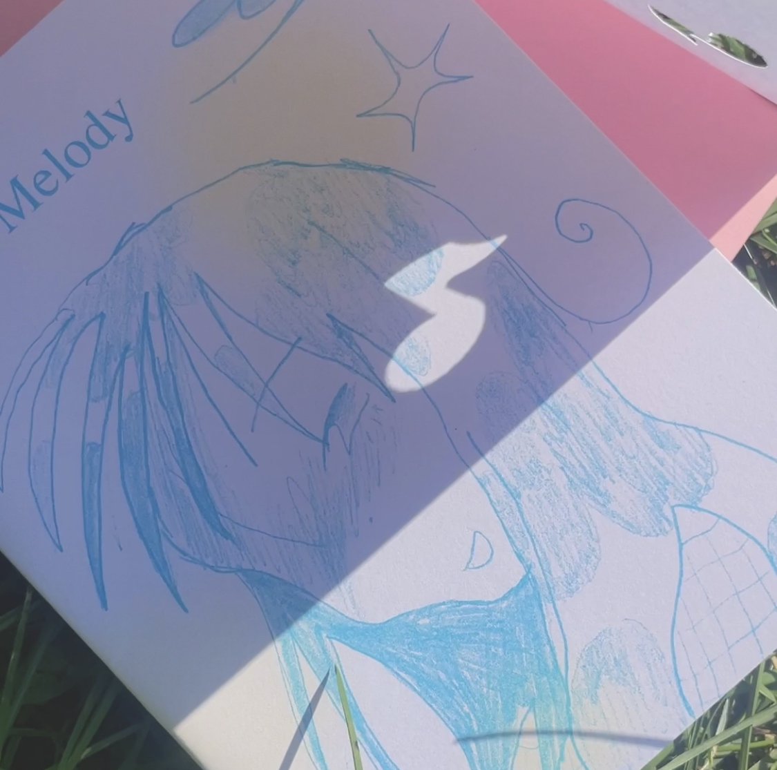 self printed risograph zine. yellow & aqua ink on white & pastel pink paper. Each copy has a music note hole punched in the back cover. Measures approx. 4.25 x 5.5 inches