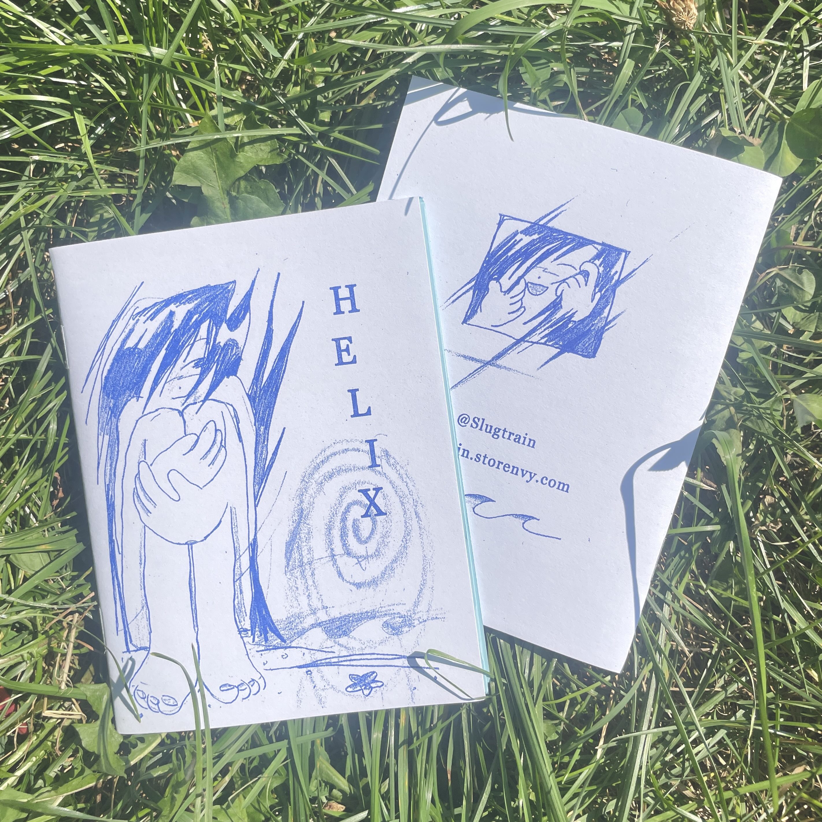 self printed risograph zine. Printed in medium blue ink on white cover & pastel blue inner pages. Measures approx. 4.25 x 5.5 inches