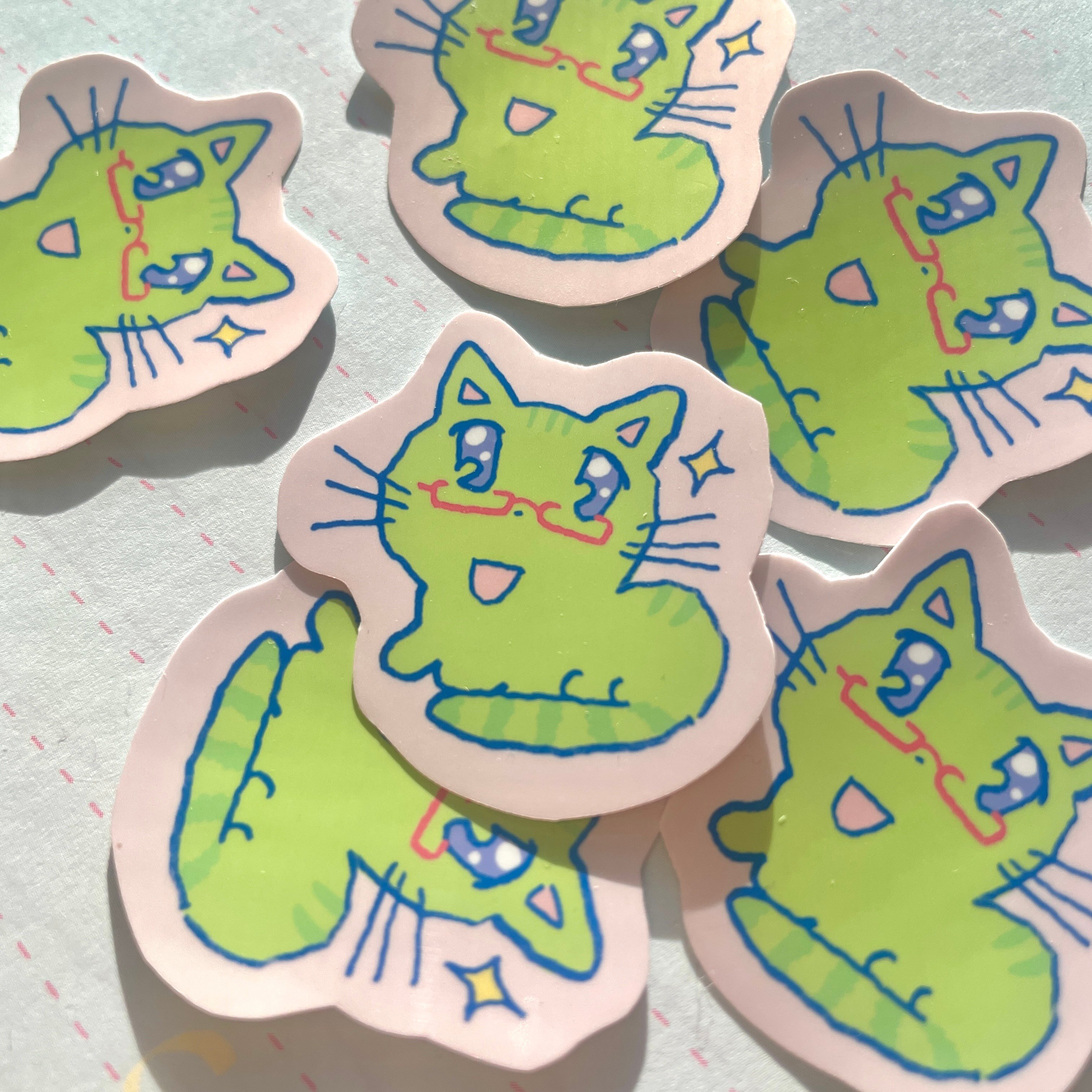 1.5 inch sticker of a little booger cat who wears reading glasses