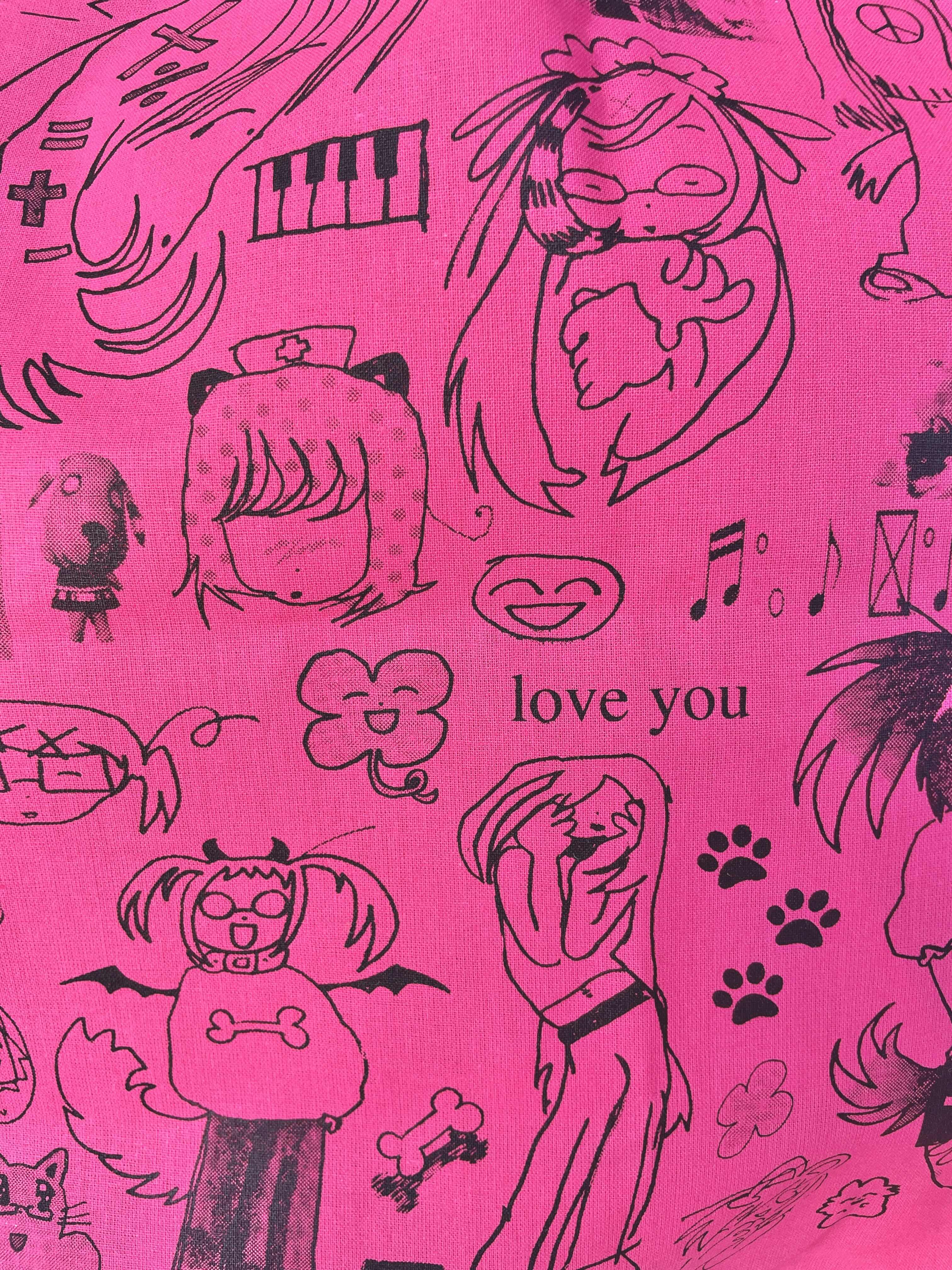 black ink on a hot pink 100% cotton tote bag, measuring approx 15 x 16 inches