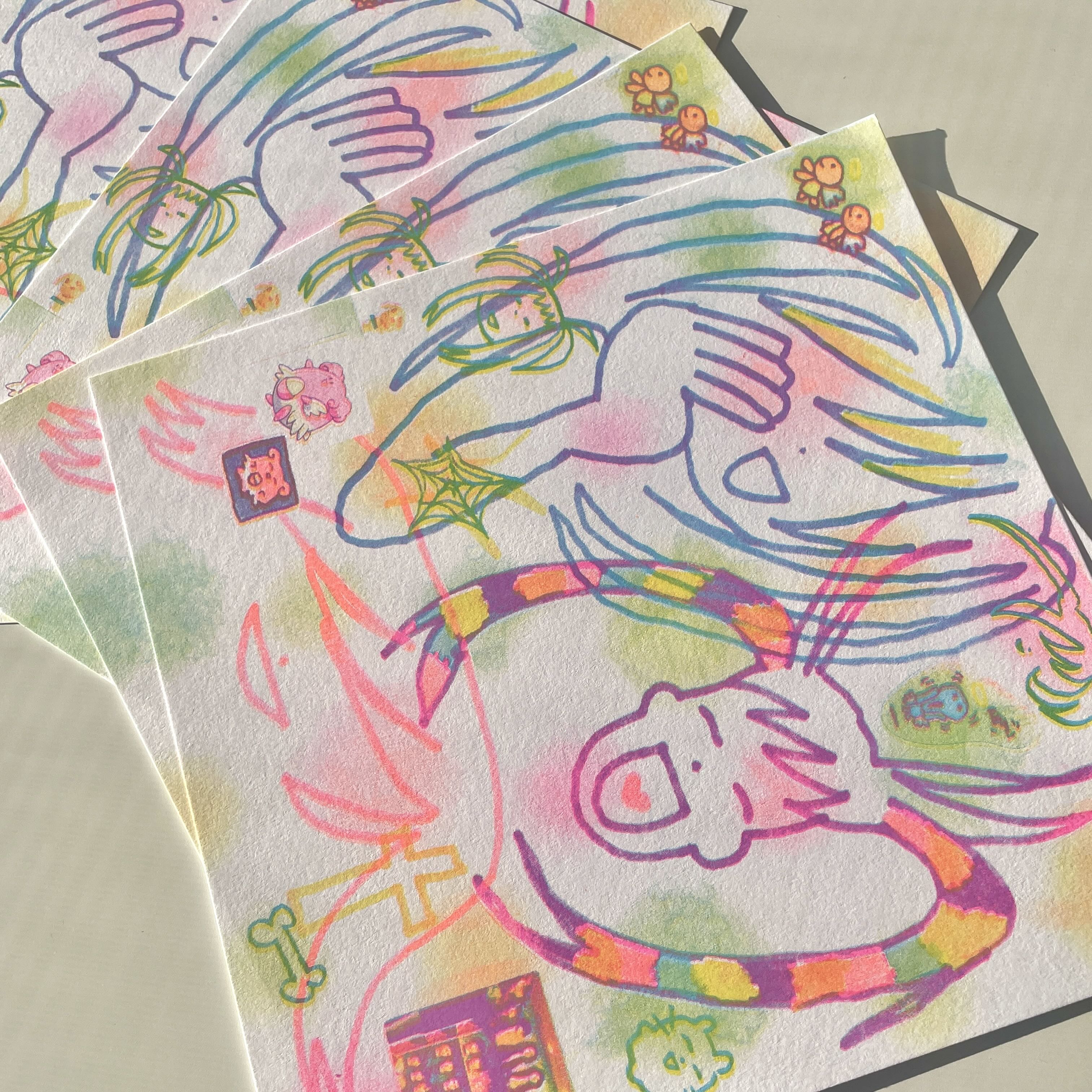 self printed with aqua, fluorescent orange, fluorescent pink, and yellow on lettermark print paper.
