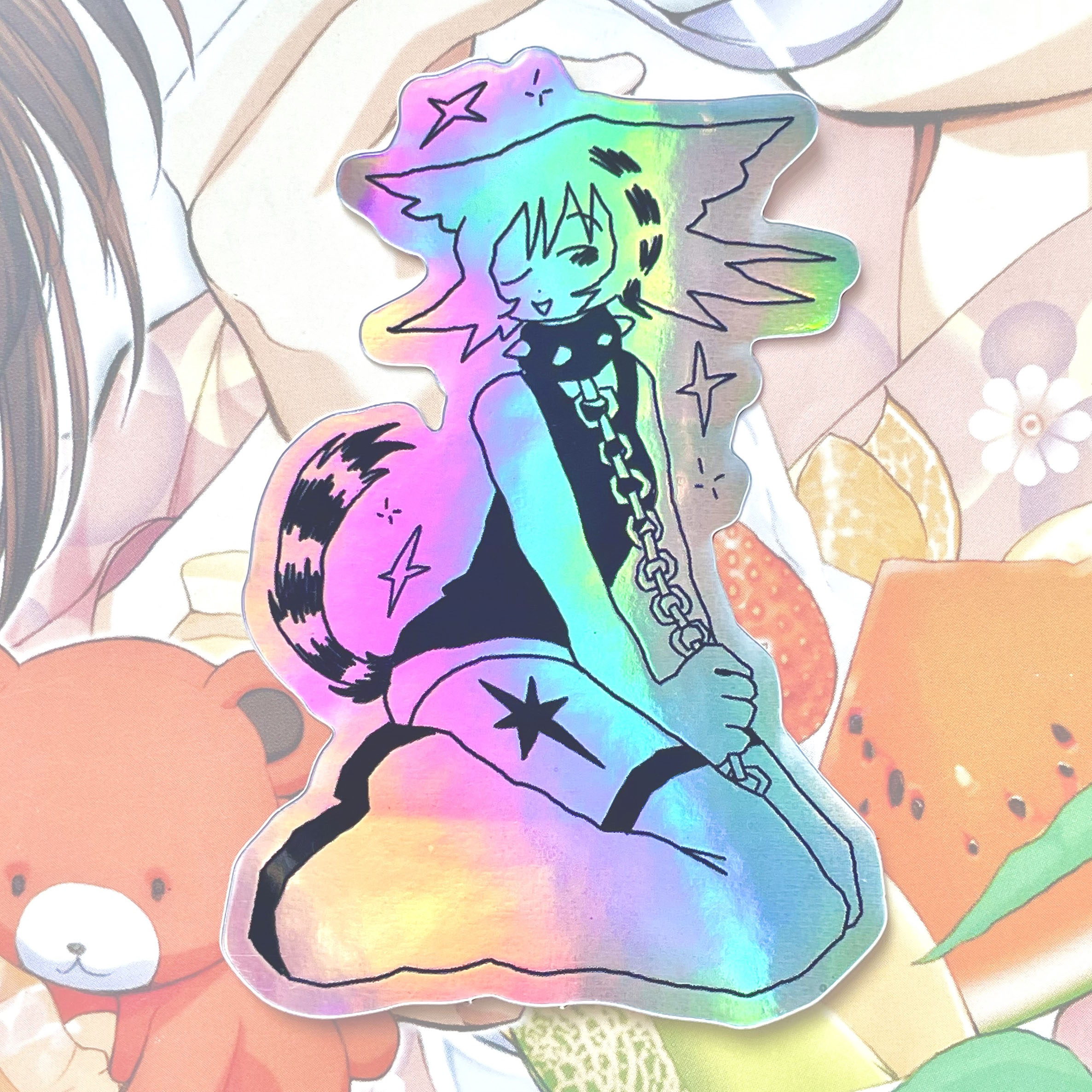 holographic vinyl sticker of a cat girl measures approx 3 x 2 inches
