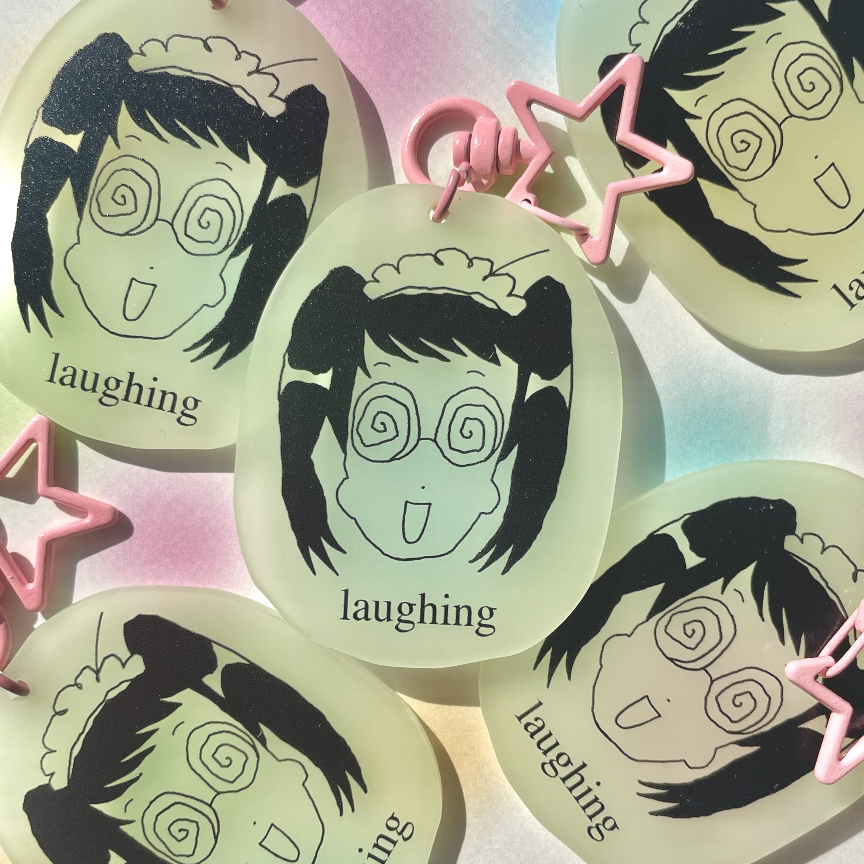 single sided printing on glow-in-the-dark acrylic, with a pastel pink star clasp
